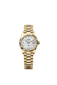 Oyster, 28 mm, yellow gold Reference279178 Graceful elegance This Oyster PerpetualLady-Datejustin18 ct yellow goldfeaturesa white mother-of-pearl, diamond-setdial anda Presidentbracelet. Mother-of-Pearl Dial Highlighting natural beauty This dial features diamonds in 18 ct gold settings. Mother-of-pearl is by its nature full of mystery and surprises. Depending on its origin, it can be pink, white, black or yellow. It differs in colour, intensity and structure according to the part of the shell from which it is extracted. At Rolex, mother-of-pearl is never artificially coloured. Instead, particular know-how and skill are devoted to simply highlighting its natural beauty and preserving the original hues. As all mother-of-pearl dials are unique pieces, an identical dial will never be found on another wrist. Fluted bezel A Rolex signature The Rolex fluted bezel is a mark of distinction. Originally, the fluting of the Oyster bezel had a functional purpose: it served to screw the bezel onto the case helping to ensure the waterproofness of the watch. It was therefore identical to the fluting on the case back, which was also screwed onto the case for waterproofness, using specific Rolex tools. Over time, the fluting became an aesthetic element, a genuine Rolex signature feature. Today the fluted bezel is a mark of distinction, in gold on this Lady-Datejust. 18 ct yellow gold Commitment to excellence By operating its own exclusive foundry, Rolex has the unrivalled ability to cast the highest quality 18 ct gold alloys. According to the proportion of silver, copper, platinum or palladium added, different types of 18 ct gold are obtained: yellow, pink or white. They are made with only the purest metals and meticulously inspected in an in-house laboratory with state-of-the-art equipment, before the gold is formed and shaped with the same painstaking attention to quality. Rolex's commitment to excellence begins at the source. The President bracelet The ultimate refinement This Lady-Datejust is offered on a prestigious President bracelet. Always in solid gold or platinum, the bracelets benefit from a concealed attachment beneath the bezel which ensures seamless visual continuity between the bracelet and case. A new-generation concealed Crownclasp, opened with a hinged Rolex crown, adds the final aesthetic and functional touch to these sumptuous bracelets.