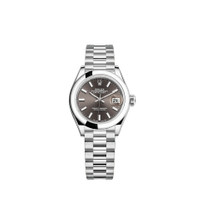 Oyster, 28 mm, platinum THIS OYSTER PERPETUAL LADY-DATEJUST IN PLATINUM FEATURES A DARK GREY DIAL AND A PRESIDENT BRACELET. The light reflections on the case sides and lugs highlight the elegant profile of the 28 mm Oyster case, which is fitted with a Domed bezel. Rolex's classic feminine watch, the Lady-Datejust is in the lineage of the Datejust, the emblematic model that has been a byword for style and accurate timekeeping. Model features - PLATINUM - THE PRESIDENT BRACELET - THE CYCLOPS LENS - 2236 MOVEMENT Specifications Reference 279166