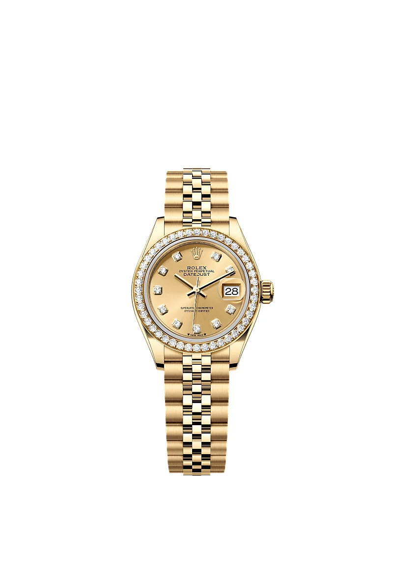 Oyster, 28 mm, yellow gold and diamonds Reference279138RBR Graceful elegance This Oyster PerpetualLady-Datejustin18 ct yellow goldfeaturesa champagne colour, diamond-setdial anda Jubileebracelet. Champagne-colour dial A watchmaking technique This dial features diamonds in 18 ct gold settings. The sunray finish creates delicate light reflections on many dials in the Oyster Perpetual collection. It is obtained using masterful brushing techniques that create grooves running outwards from the centre of the dial. Light is diffused consistently along each engraving, creating a characteristic subtle glow that moves depending on the position of the wrist. Once the sunray finish has been completed, the dial colour is applied using Physical Vapour Deposition or electroplating. A light coat of varnish gives the dial its final look. Diamond-set bezel A sparkling symphony Gem-setters, like sculptors, finely carve the precious metal to hand-shape the seat in which each gemstone will be perfectly lodged. With the art and craft of a jeweller, the stone is placed and meticulously aligned with the others, then firmly secured in its gold or platinum setting. Besides the intrinsic quality of the stones, several other criteria contribute to the beauty of Rolex gem-setting: the precise alignment of the height of the gems, their orientation and position, the regularity, strength and proportions of the setting as well as the intricate finishing of the metalwork. A sparkling symphony to enhance the watch and enchant the wearer. 18 ct yellow gold Commitment to excellence By operating its own exclusive foundry, Rolex has the unrivalled ability to cast the highest quality 18 ct gold alloys. According to the proportion of silver, copper, platinum or palladium added, different types of 18 ct gold are obtained: yellow, pink or white. They are made with only the purest metals and meticulously inspected in an in-house laboratory with state-of-the-art equipment, before the gold is formed and shaped with the same painstaking attention to quality. Rolex's commitment to excellence begins at the source. The Jubilee bracelet Supple and comfortable The design, development and production of Rolex bracelets and clasps, as well as the stringent tests they face, involve advanced high technology. And, as with all the components of the watch, aesthetic controls by the human eye guarantee impeccable beauty. The Jubilee, a supple and comfortable five-piece link metal bracelet, was designed and made especially for the launch of the Oyster Perpetual Datejust in 1945.