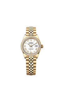 Oyster, 28 mm, yellow gold and diamonds Reference279138RBR Graceful elegance This Oyster PerpetualLady-Datejustin18 ct yellow goldfeaturesa whitedial anda Jubileebracelet. Diamond-set bezel A sparkling symphony Gem-setters, like sculptors, finely carve the precious metal to hand-shape the seat in which each gemstone will be perfectly lodged. With the art and craft of a jeweller, the stone is placed and meticulously aligned with the others, then firmly secured in its gold or platinum setting. Besides the intrinsic quality of the stones, several other criteria contribute to the beauty of Rolex gem-setting: the precise alignment of the height of the gems, their orientation and position, the regularity, strength and proportions of the setting as well as the intricate finishing of the metalwork. A sparkling symphony to enhance the watch and enchant the wearer. White dial Limitless freedom Lacquer combines almost limitless freedom of colour with intensity and a smooth finish. The lacquering technique consists of successively depositing six thin layers of lacquer on a brass base plate. A colourless varnish is then applied to give the colour or shade all of its depth and shine. Once the varnish is dry, the surface of the dial is polished to magnify the colour; the dial is then ready to be pad printed and receive its appliques. 18 ct yellow gold Commitment to excellence By operating its own exclusive foundry, Rolex has the unrivalled ability to cast the highest quality 18 ct gold alloys. According to the proportion of silver, copper, platinum or palladium added, different types of 18 ct gold are obtained: yellow, pink or white. They are made with only the purest metals and meticulously inspected in an in-house laboratory with state-of-the-art equipment, before the gold is formed and shaped with the same painstaking attention to quality. Rolex's commitment to excellence begins at the source. The Jubilee bracelet Supple and comfortable The design, development and production of Rolex bracelets and clasps, as well as the stringent tests they face, involve advanced high technology. And, as with all the components of the watch, aesthetic controls by the human eye guarantee impeccable beauty. The Jubilee, a supple and comfortable five-piece link metal bracelet, was designed and made especially for the launch of the Oyster Perpetual Datejust in 1945.