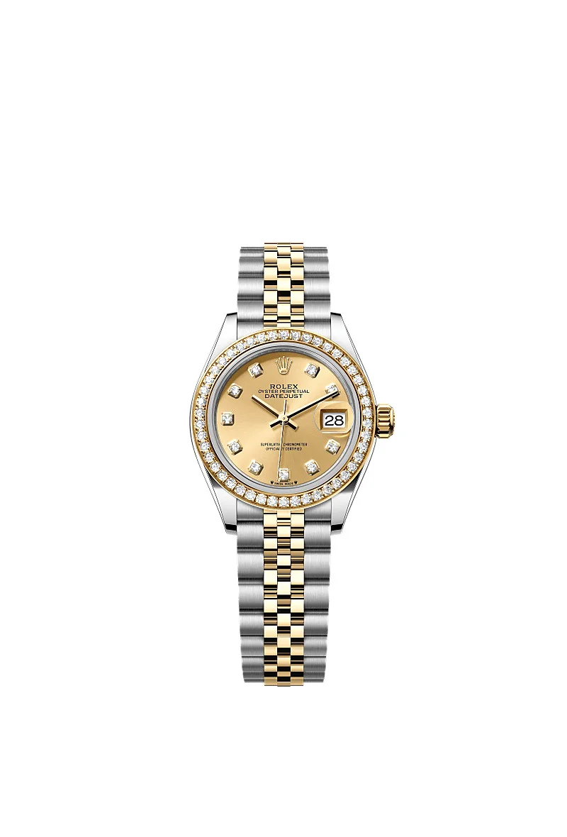 Oyster, 28 mm, Oystersteel, yellow gold and diamonds Reference279383RBR Graceful elegance This Oyster PerpetualLady-DatejustinOystersteel and yellow goldfeaturesa champagne colour, diamond-setdial anda Jubileebracelet. Champagne-colour dial A watchmaking technique This dial features diamonds in 18 ct gold settings. The sunray finish creates delicate light reflections on many dials in the Oyster Perpetual collection. It is obtained using masterful brushing techniques that create grooves running outwards from the centre of the dial. Light is diffused consistently along each engraving, creating a characteristic subtle glow that moves depending on the position of the wrist. Once the sunray finish has been completed, the dial colour is applied using Physical Vapour Deposition or electroplating. A light coat of varnish gives the dial its final look. Diamond-set bezel A sparkling symphony Gem-setters, like sculptors, finely carve the precious metal to hand-shape the seat in which each gemstone will be perfectly lodged. With the art and craft of a jeweller, the stone is placed and meticulously aligned with the others, then firmly secured in its gold or platinum setting. Besides the intrinsic quality of the stones, several other criteria contribute to the beauty of Rolex gem-setting: the precise alignment of the height of the gems, their orientation and position, the regularity, strength and proportions of the setting as well as the intricate finishing of the metalwork. A sparkling symphony to enhance the watch and enchant the wearer. Yellow Rolesor A meeting of two metals Gold is coveted for its lustre and nobility. Steel reinforces strength and reliability. Together, they harmoniously combine the best of their properties. A true Rolex signature, Rolesor has featured on Rolex models since the early 1930s, and was trademarked as a name in 1933. It is one of the prominent pillars of the Oyster collection. The Jubilee bracelet Supple and comfortable The design, development and production of Rolex bracelets and clasps, as well as the stringent tests they face, involve advanced high technology. And, as with all the components of the watch, aesthetic controls by the human eye guarantee impeccable beauty. The Jubilee, a supple and comfortable five-piece link metal bracelet, was designed and made especially for the launch of the Oyster Perpetual Datejust in 1945.