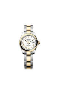 Oyster, 28 mm, Oystersteel and yellow gold Reference279163 Graceful elegance This Oyster PerpetualLady-DatejustinOystersteel and yellow goldfeaturesa whitedial andan Oysterbracelet. White dial Limitless freedom Lacquer combines almost limitless freedom of colour with intensity and a smooth finish. The lacquering technique consists of successively depositing six thin layers of lacquer on a brass base plate. A colourless varnish is then applied to give the colour or shade all of its depth and shine. Once the varnish is dry, the surface of the dial is polished to magnify the colour; the dial is then ready to be pad printed and receive its appliques. Yellow Rolesor A meeting of two metals Gold is coveted for its lustre and nobility. Steel reinforces strength and reliability. Together, they harmoniously combine the best of their properties. A true Rolex signature, Rolesor has featured on Rolex models since the early 1930s, and was trademarked as a name in 1933. It is one of the prominent pillars of the Oyster collection. The Oyster bracelet Alchemy of form and function The Oyster bracelet is a perfect alchemy of form and function, aesthetics and technology, designed to be both robust and comfortable. It is equipped with an Oysterclasp and the Easylink comfort extension link, also exclusive to Rolex. This ingenious system allows the wearer to increase the bracelet length by approximately 5 mm, providing additional comfort in any circumstance.