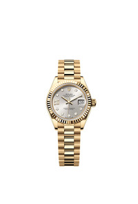 Oyster, 28 mm, yellow gold Reference279178 Graceful elegance This Oyster PerpetualLady-Datejustin18 ct yellow goldfeaturesa silver, diamond-setdial anda Presidentbracelet. Silver dial A watchmaking technique This dial features diamonds in 18 ct gold settings and a Roman IX in 18 ct gold, set with 8 diamonds. The sunray finish creates delicate light reflections on many dials in the Oyster Perpetual collection. It is obtained using masterful brushing techniques that create grooves running outwards from the centre of the dial. Light is diffused consistently along each engraving, creating a characteristic subtle glow that moves depending on the position of the wrist. Once the sunray finish has been completed, the dial colour is applied using Physical Vapour Deposition or electroplating. A light coat of varnish gives the dial its final look. Fluted bezel A Rolex signature The Rolex fluted bezel is a mark of distinction. Originally, the fluting of the Oyster bezel had a functional purpose: it served to screw the bezel onto the case helping to ensure the waterproofness of the watch. It was therefore identical to the fluting on the case back, which was also screwed onto the case for waterproofness, using specific Rolex tools. Over time, the fluting became an aesthetic element, a genuine Rolex signature feature. Today the fluted bezel is a mark of distinction, in gold on this Lady-Datejust. 18 ct yellow gold Commitment to excellence By operating its own exclusive foundry, Rolex has the unrivalled ability to cast the highest quality 18 ct gold alloys. According to the proportion of silver, copper, platinum or palladium added, different types of 18 ct gold are obtained: yellow, pink or white. They are made with only the purest metals and meticulously inspected in an in-house laboratory with state-of-the-art equipment, before the gold is formed and shaped with the same painstaking attention to quality. Rolex's commitment to excellence begins at the source. The President bracelet The ultimate refinement This Lady-Datejust is offered on a prestigious President bracelet. Always in solid gold or platinum, the bracelets benefit from a concealed attachment beneath the bezel which ensures seamless visual continuity between the bracelet and case. A new-generation concealed Crownclasp, opened with a hinged Rolex crown, adds the final aesthetic and functional touch to these sumptuous bracelets.