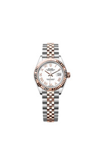 Oyster, 28 mm, Oystersteel and Everose gold Reference279171 Graceful elegance This Oyster PerpetualLady-DatejustinOystersteel and Everose goldfeaturesa whitedial anda Jubileebracelet. Fluted bezel A Rolex signature The Rolex fluted bezel is a mark of distinction. Originally, the fluting of the Oyster bezel had a functional purpose: it served to screw the bezel onto the case helping to ensure the waterproofness of the watch. It was therefore identical to the fluting on the case back, which was also screwed onto the case for waterproofness, using specific Rolex tools. Over time, the fluting became an aesthetic element, a genuine Rolex signature feature. Today the fluted bezel is a mark of distinction, in gold on this Lady-Datejust. White dial Limitless freedom Lacquer combines almost limitless freedom of colour with intensity and a smooth finish. The lacquering technique consists of successively depositing six thin layers of lacquer on a brass base plate. A colourless varnish is then applied to give the colour or shade all of its depth and shine. Once the varnish is dry, the surface of the dial is polished to magnify the colour; the dial is then ready to be pad printed and receive its appliques. Everose Rolesor A meeting of two metals Gold is coveted for its lustre and nobility. Steel reinforces strength and reliability. Together, they harmoniously combine the best of their properties. A true Rolex signature, Rolesor has featured on Rolex models since the early 1930s, and was trademarked as a name in 1933. It is one of the prominent pillars of the Oyster collection. The Jubilee bracelet Supple and comfortable The design, development and production of Rolex bracelets and clasps, as well as the stringent tests they face, involve advanced high technology. And, as with all the components of the watch, aesthetic controls by the human eye guarantee impeccable beauty. The Jubilee, a supple and comfortable five-piece link metal bracelet, was designed and made especially for the launch of the Oyster Perpetual Datejust in 1945.