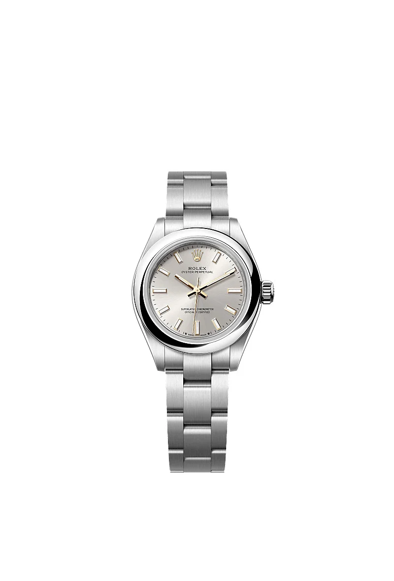 Oyster, 28 mm, Oystersteel Reference276200 Make the world your Oyster TheOyster Perpetual 28witha silverdial andan Oysterbracelet. Silver dial A watchmaking technique The sunray finish creates delicate light reflections on many dials in the Oyster Perpetual collection. It is obtained using masterful brushing techniques that create grooves running outwards from the centre of the dial. Light is diffused consistently along each engraving, creating a characteristic subtle glow that moves depending on the position of the wrist. Once the sunray finish has been completed, the dial colour is applied using Physical Vapour Deposition or electroplating. A light coat of varnish gives the dial its final look. Oystersteel Highly resistant to corrosion Rolex uses Oystersteel for its steel watch cases. Specially developed by the brand, Oystersteel belongs to the 904L steel family, alloys most commonly used in high-technology and in the aerospace and chemical industries, where maximum resistance to corrosion is essential. Oystersteel is extremely resistant, offers an exceptional finish once polished and maintains its beauty even in the harshest environments. The Oyster bracelet Alchemy of form and function The Oyster bracelet is a perfect alchemy of form and function, aesthetics and technology. First introduced in the late 1930s, this particularly robust and comfortable metal bracelet with its broad, flat three-piece links remains the most universal bracelet in the Oyster collection. For the Oyster Perpetual models the Oyster bracelet is fitted with an Oysterclasp.