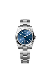 Oyster, 34 mm, Oystersteel Reference124200 Make the world your Oyster TheOyster Perpetual 34witha bright bluedial andan Oysterbracelet. Bright blue dial A watchmaking technique The sunray finish creates delicate light reflections on many dials in the Oyster Perpetual collection. It is obtained using masterful brushing techniques that create grooves running outwards from the centre of the dial. Light is diffused consistently along each engraving, creating a characteristic subtle glow that moves depending on the position of the wrist. Once the sunray finish has been completed, the dial colour is applied using Physical Vapour Deposition or electroplating. A light coat of varnish gives the dial its final look. Oystersteel Highly resistant to corrosion Rolex uses Oystersteel for its steel watch cases. Specially developed by the brand, Oystersteel belongs to the 904L steel family, alloys most commonly used in high-technology and in the aerospace and chemical industries, where maximum resistance to corrosion is essential. Oystersteel is extremely resistant, offers an exceptional finish once polished and maintains its beauty even in the harshest environments. The Oyster bracelet Alchemy of form and function The Oyster bracelet is a perfect alchemy of form and function, aesthetics and technology. First introduced in the late 1930s, this particularly robust and comfortable metal bracelet with its broad, flat three-piece links remains the most universal bracelet in the Oyster collection. For the Oyster Perpetual models the Oyster bracelet is fitted with an Oysterclasp.