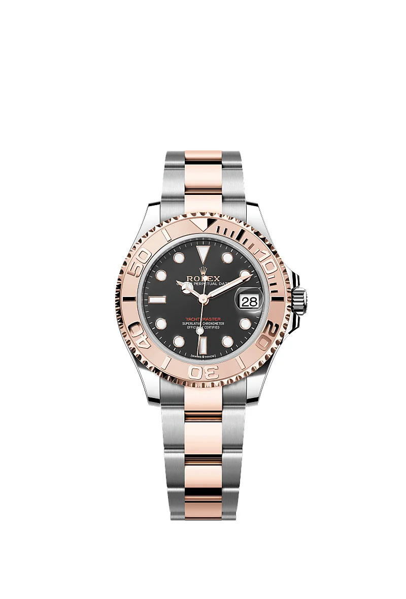 Oyster, 37 mm, Oystersteel and Everose gold Reference268621 Staying on course The Oyster PerpetualYacht-Master 37inOystersteel and Everose goldwithan Oysterbracelet. Bidirectional Rotatable Bezel Timing the distance The Yacht-Master’s bidirectional rotatable 60-minute graduated bezel is made entirely from precious metals or fitted with a Cerachrom insert in high-tech ceramic. The raised polished numerals and graduations stand out clearly against a matt, sand-blasted background. This functional bezel – which allows the wearer to calculate, for example, the sailing time between two buoys – is also a key component in the model’s distinctive visual identity. Intense black dial Exceptional legibility Like all Rolex Professional watches, the Yacht-Master 37 offers exceptional legibility in all circumstances, and especially in the dark, thanks to its Chromalight display. The broad hands and hour markers in simple shapes – triangles, circles, rectangles – are filled with a luminescent material emitting a long-lasting glow. Everose Rolesor A meeting of two metals Gold is coveted for its lustre and nobility. Steel reinforces strength and reliability. Together, they harmoniously combine the best of their properties. A true Rolex signature, Rolesor has featured on Rolex models since the early 1930s, and was trademarked as a name in 1933. It is one of the prominent pillars of the Oyster collection. The Oyster bracelet Alchemy of form and function The Oyster bracelet is a perfect alchemy of form and function, aesthetics and technology, designed to be both robust and comfortable. It is equipped with an Oysterlock folding clasp, which prevents accidental opening and the Easylink comfort extension link, also exclusive to Rolex. This ingenious system allows the wearer to increase the bracelet length by approximately 5 mm, providing additional comfort in any circumstance.