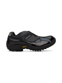 Handcrafted low-top paneled grained faux-leather, patent faux-leather, and mesh slip-on sneakers in black. · Elasticized gusset at inner side · Rubberized logo patch at outer side · Logo hardware at outer side · Mesh lining · Treaded Vibram® rubber sole Supplier color: Carbon patent beyond leather Upper: synthetic, textile. Sole: thermoplastic polyurethane. Made in Portugal 241654F128011