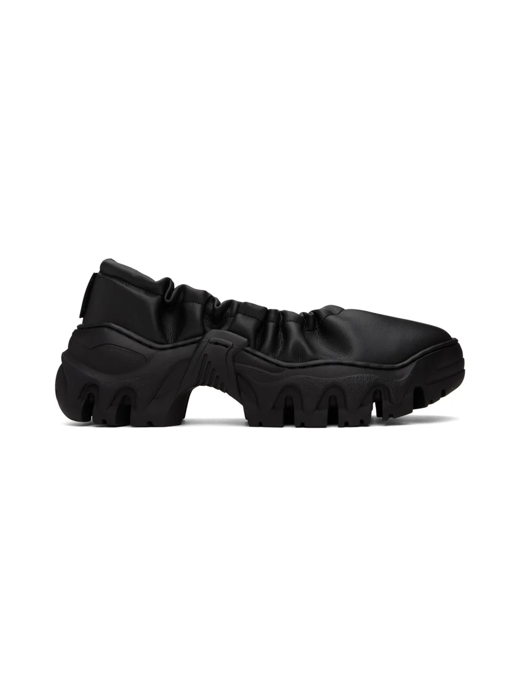 Handcrafted grained faux-leather ballerina flats in black. · Bungee-style drawstring at elasticized collar · Logo flag at heel tab · Logo embossed at heel counter · Mesh lining · Treaded sculptural TPU platform sole · Platform: H2" Supplier color: Black beyond leather Upper: synthetic. Sole: thermoplastic polyurethane. Made in Portugal 241654F118017