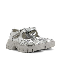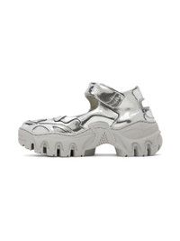 Handcrafted low-top patent faux-leather sneakers in metallic silver tone. · Cutouts throughout · Paneled construction · Velcro ankle strap · Logo flag at outer side · Logo engraved at heel counter · Mesh and buffed faux-leather lining · Treaded TPU platform sole · Platform: H2" Available exclusively at SSENSE. Supplier color: Silver Upper: synthetic. Sole: thermoplastic polyurethane. Made in Portugal 241654F128018