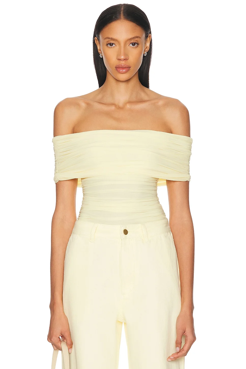 Details - 90% polyester, 10% spandex - Dry clean only - Hidden side zipper closure - Off-shoulder styling - Slinky jersey fabric with ruching detail - Item not sold as a set - Made in China - Our Style No. RONR-WS458 - Manufacturer Style No. 4151222TJE