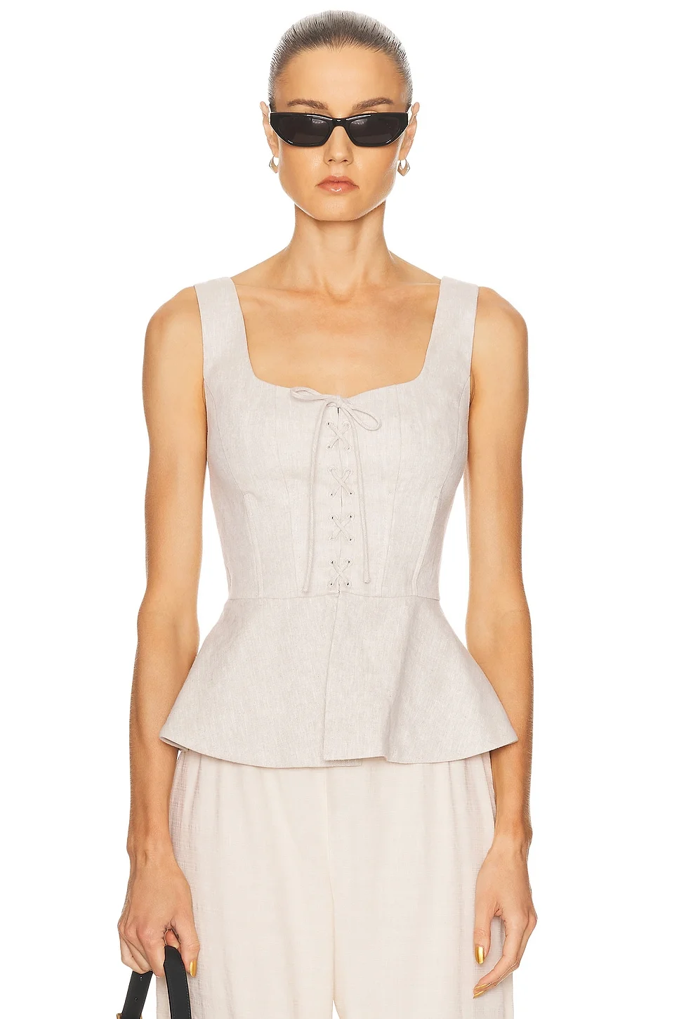 Details - Self: 100% linen - Lining: 100% cotton - Dry clean only - Hidden back zipper closure - Front lace-up tie closure - Front and back scoop neckline - Linen fabric with front slit - Item not sold as a set - Made in China - Our Style No. RONR-WS478 - Manufacturer Style No. 4251235LIN
