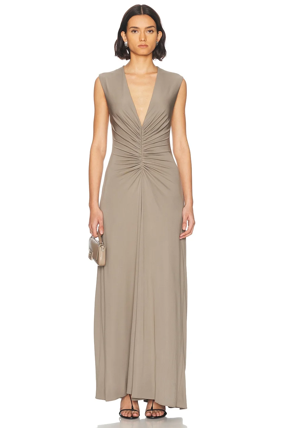Details - 95% viscose, 5% spandex - Made in China - Dry clean only - Fully lined - Hidden back zipper closure - Deep V-neckline - Slinky jersey fabric with ruching detail - Our Style No. RONR-WD755 - Manufacturer Style No. 4184280JER