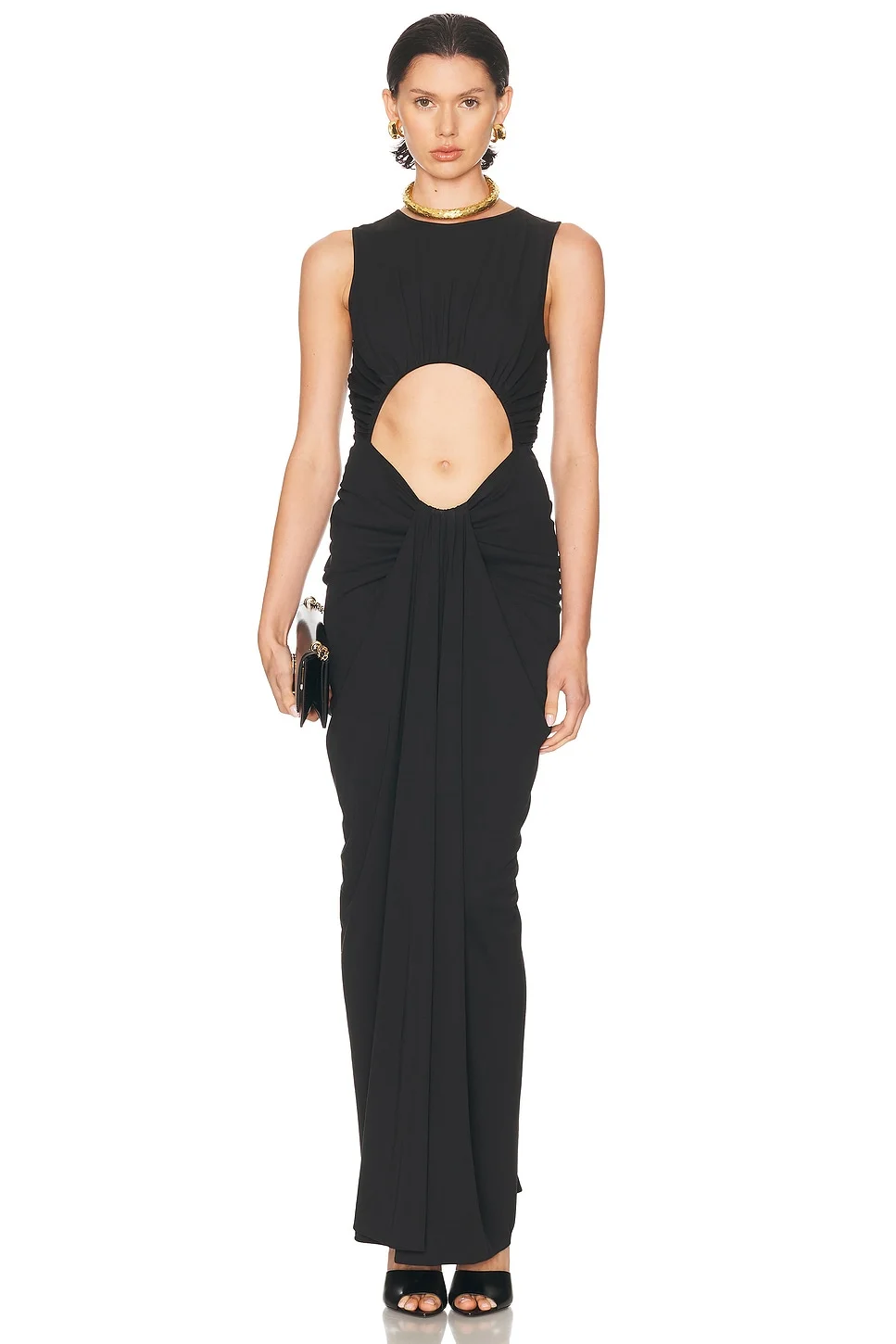 Details - Self: 100% polyester - Lining: 88% nylon, 12% spandex - Dry clean only - Partially lined - Hidden back zipper closure - Front cut-out detail - Crepe fabric with ruching detail - Made in China - Our Style No. RONR-WD796 - Manufacturer Style No. 4284279JER