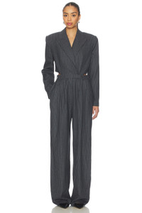 - Self: 40% wool 29% polyester 28% viscose 3% spandex Lining:55% viscose 45% polyester - Made in China - Dry clean only - Zip fly button and hook closure at hips - Jumpsuit blazer style with back cut out.3-pocket styling - Shoulder pads - Revolve Style No. RONR-WC35 - Manufacturer Style No. 4419116PIN