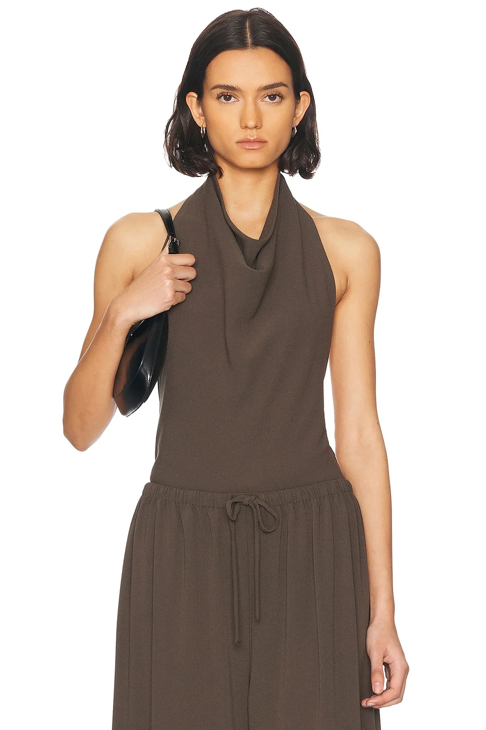 Details - Self 1: 70% acetate, 30% polyester - Self 2: 90% polyester, 10% spandex - Made in China - Dry clean only - Halterneck button loop and back tie-up closures - Gusset button snap closure - Cowl-neckline - Crepe fabric with open back - Item not sold as a set - Our Style No. RONR-WS454 - Manufacturer Style No. 4119114JER