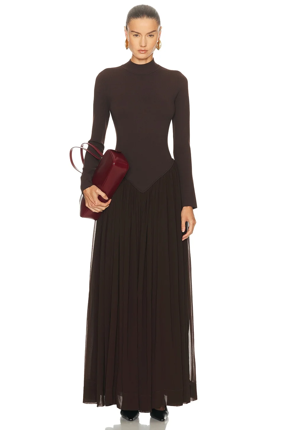 Details - Self 1: 83% viscose, 17% polyester - Self 2: 100% polyester - Hand wash - Partially lined - Hidden back zipper closure - Mockneck styling - Midweight knit fabric at top - Chiffon fabric at skirt - Made in China - Our Style No. RONR-WD811 - Manufacturer Style No. 4484093KNT