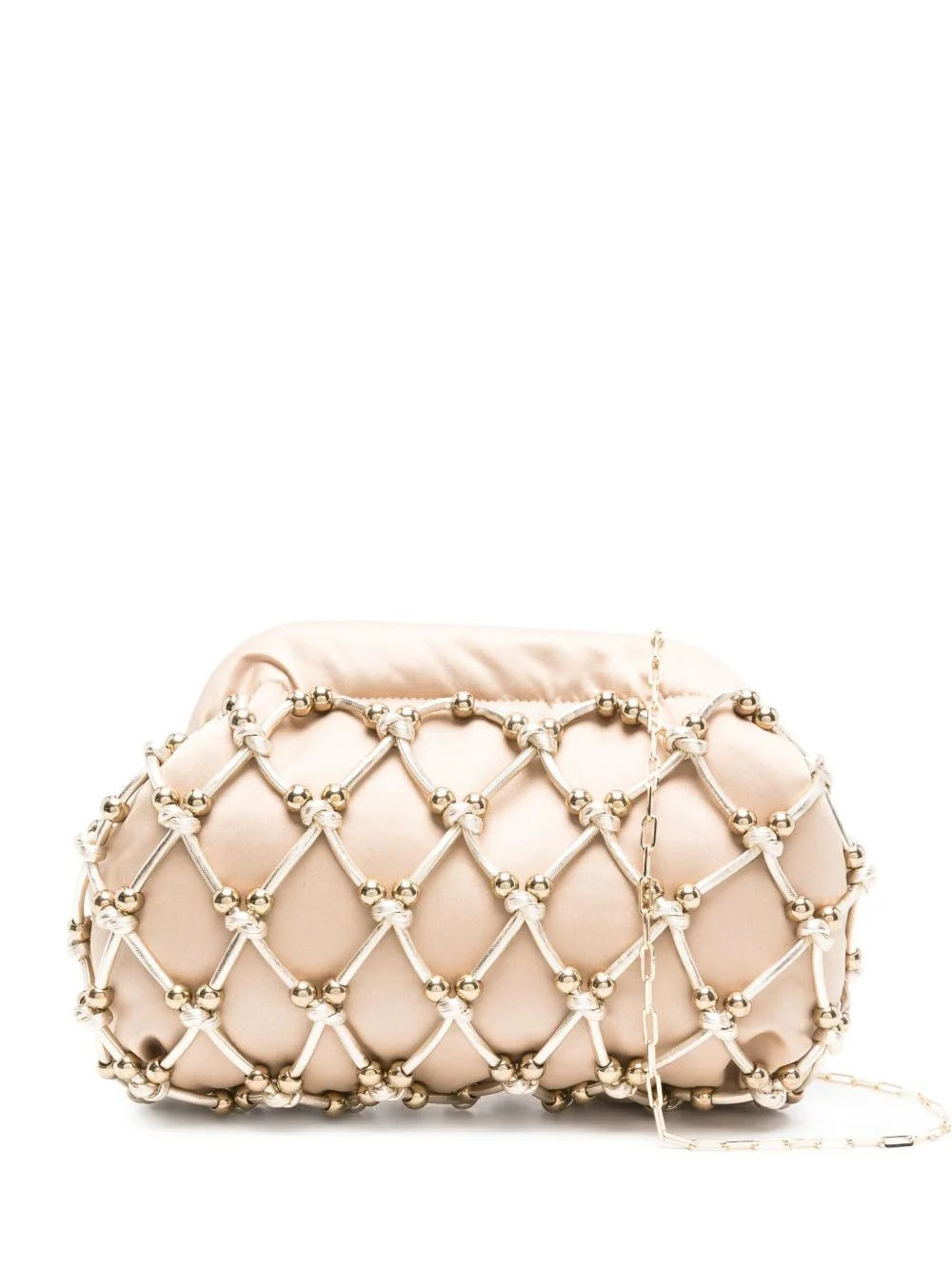 beaded satin clutch Highlights - Beige - Satin fabric - Beaded embellishment - Lattice pattern - Gold-tone beads - Chain strap Made in Italy Composition Outer: Brass 100%, Satin 100% SIZE & FIT Model measurements Height 5 ft 10 in(1.77 m) Bust/Chest 32.28 in(82 cm) Hips 35.03 in(89 cm) Waist 25.19 in(64 cm) Measurement DEPTH 2.36 in(6 cm) HEIGHT 5.9 in(15 cm) WIDTH 9.84 in(25 cm)