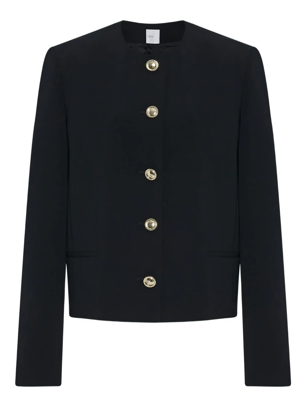 crew-neck gold-button jacket Highlights - Black - Crew neck - Gold buttons - Long sleeves - Straight hem Made in United States Composition Polyester 89%, Polyurethane 11%