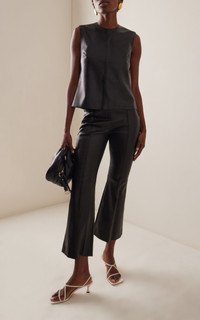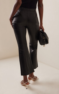 Cut to flatter and elongate the body, this ultra-soft leather pant has a mid-rise, flared-leg silhouette that hits just above the ankle. Pintuck seaming down the front lengthens further, while the elasticized waist enhances the ease of wear — imparting a relaxed sensibility to the otherwise luxe style. The center point of Rosetta Getty’s popular leather offering, this Stretch Plonge fabric pairs buttery-soft lambskin with a stretch cotton backing for a leisurely feel. Tanned in France, it has a sexy, slightly shiny finish while maintaining a substantial feel for structure and shape. PRODUCT DETAILS - Not eligible for expedited shipping - Pull on - Composition: 100% Lambskin; backing: 98% cotton, 2% elastic - Specialist clean - Made in the USA SIZE & FIT - Our model is wearing a size US 2 - Model is 5'10" with a 34" bust, 24" waist, and 35" hip