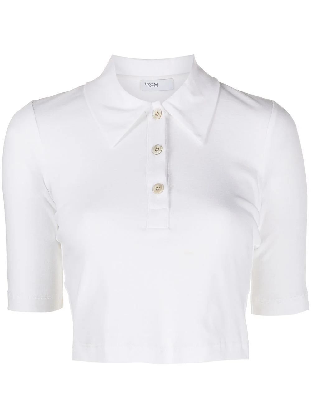 cropped shortsleeved polo shirt white cotton polo collar short sleeves straight hem cropped Made in United States Composition Cotton 100% SIZE & FIT Model measurements Height 5 ft 10 in(1.77 m) Bust/Chest 33.85 in(86 cm) Hips 35.03 in(89 cm) Waist 24.01 in(61 cm) FittingInformation This piece fits true to size. We recommend you get your regular size Cut for a close fit Made with a lightweight stretch fabric
