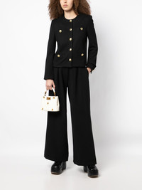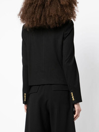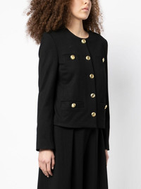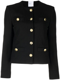 fitted button-down fastening jacket jet black round neck front button fastening long sleeves four welt pockets Made in United States Composition Body: Viscose 96%, Elastane 4% SIZE & FIT Model measurements Height 5 ft 10 in(1.78 m) Bust/Chest 33.46 in(85 cm) Hips 35.43 in(90 cm) Waist 24.4 in(62 cm) Washing instructions Dry Clean Only