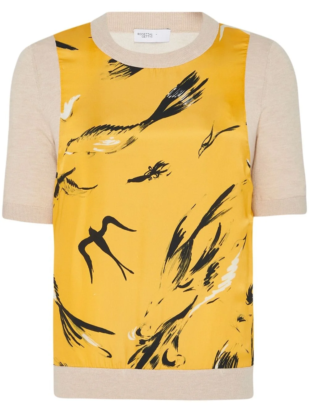 graphic-print fine-knit top Highlights - Beige/sunflower yellow - Silk-merino wool-cashmere blend - Fine knit - Graphic print to the front - Crew neck - Short sleeves - Ribbed cuffs and hem Imported Composition Silk 70%, Merino 20%, Cashmere 10%