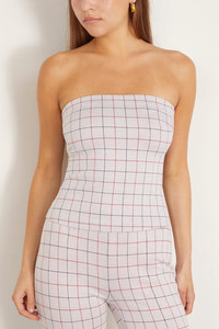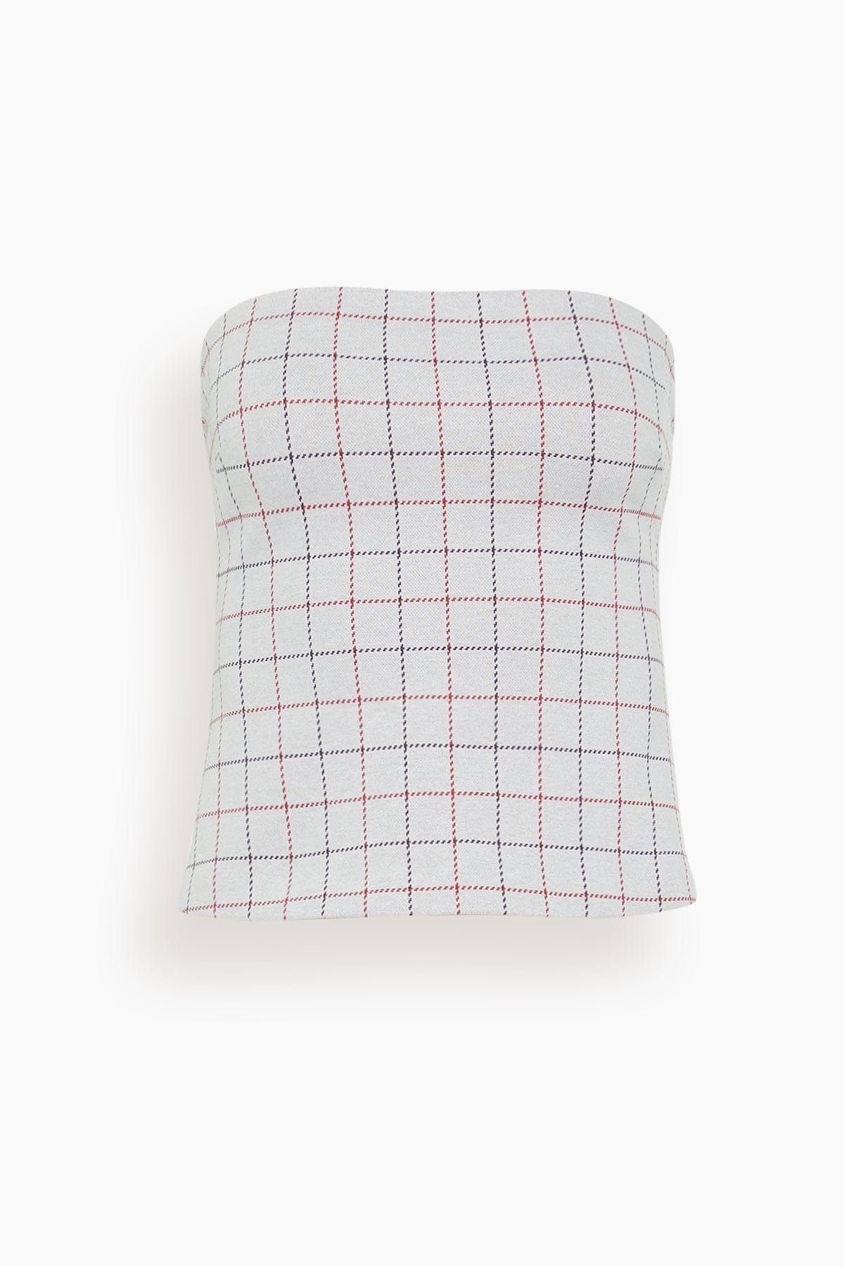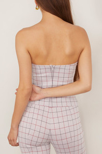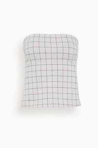 The Rosetta Getty Strapless Bandeau in Navy/Red is streamlined and versatile. This slim-fitting bandeau top is reminiscent of classic ‘90s styles. Rosetta Getty’s seasonal Striped Windowpane Interlock Jacquard lends classicism to the style, ideal for layering beneath the coordinating Peak Lapel Jacket. An exclusive fabrication for the season, the Striped Windowpane Interlock Jacquard is similar to our Interlock Jersey with a slightly slick hand and added elastic to contour the body. It's produced by an Italian mill certified for its sustainable practices by the Associazione Tessile e Salute (Health and Textiles Association) and Forest Stewardship Council (FSC), which uses viscose produced using sustainably sourced and certified FSC wood pulp. FIT DESCRIPTION MODEL MEASUREMENTS - Fits true to size, take your normal size - Strapless - Concealed back zip - 81% Viscose, 18% Polyamide, 1% Elastane - Emma is wearing a size XS - Bust: 32” - Waist: 25” - Hips: 34” - Height: 5’7”
