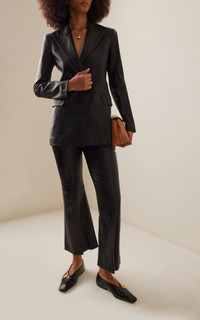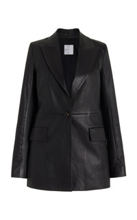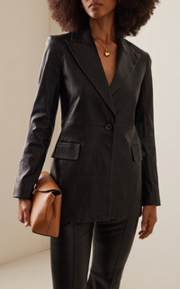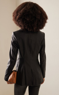 A signature Rosetta Getty style, this tailored blazer is an elevated iteration of the enduring Interlock Jersey staple. It features buttery-soft, stretch lambskin construction and is designed with sophisticated peak lapels and a longer silhouette; shaping seams provide a perfect fit. The center point of Rosetta Getty’s popular leather offering, this Stretch Plonge fabric pairs buttery-soft lambskin with a stretch cotton backing for a leisurely feel. Tanned in France, it has a sexy, slightly shiny finish while maintaining a substantial feel for structure and shape. PRODUCT DETAILS - Not eligible for expedited shipping - Button fastening at front - Composition: 100% Lambskin, Backing: 98% Cotton / 2% Elastane - Specialist clean - Made in the USA SIZE & FIT - Our model is wearing a size US 2 - Model is 5'10" with a 31.5" bust, 23.5" waist, and 35" hip