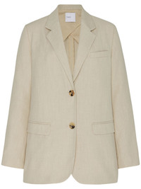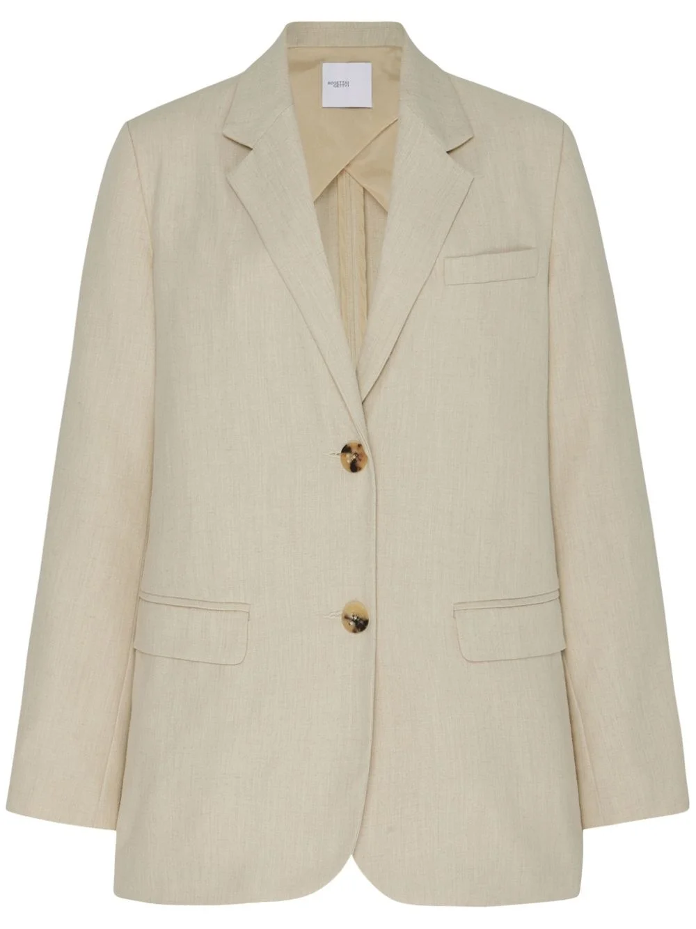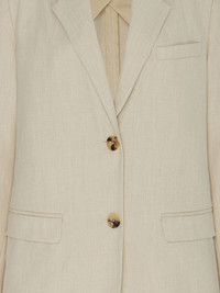 notched-lapels single-breasted blazer Highlights - Light beige - Lightweight construction - Notched lapels - Front button fastening - Long sleeves - Jetted chest pocket - Two front flap pockets - Straight hem - Partial lining Made in United States Composition Polyester 77%, Rayon 16%, Linen/Flax 7%