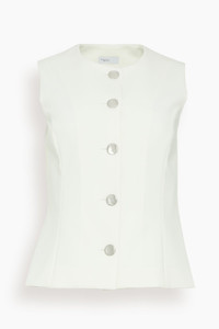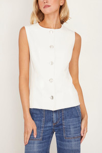 The Rosetta Getty Sleeveless Button Front Top is a must-have piece from their Resort 25 Collection. This vest features a slim silhouette with contrasting buttons that looks great when worn as a top. Wear yours with trousers and loafers. FIT DESCRIPTION MODEL MEASUREMENTS - Fits true to size, take your normal size - Sleeveless top - Button front - Slim silhouette - Jewel neckline - 89% Polyester, 11% Polyurethane - Harriet is wearing a size 2 - Bust: 32" - Waist: 24" - Hips: 30.5" - Height: 5’8.5”