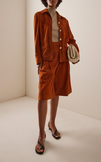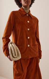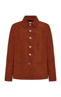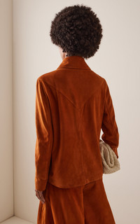 Rosetta Getty believes dressing should be effortless, so her basics are exceptionally versatile. A timeless addition to the Pre-Fall 25 collection, the Shirt Jacket expands our esteemed leather offering by introducing buttery soft lambskin suede in rich Cognac. Cut for a slim fit, the tailored style is completed with the season’s new light gold metal buttons. Lambskin Suede is a buttery-soft addition to Rosetta Getty’s Pre-Fall 25 fabric library. Cut in a refined Shirt Jacket and tailored Pleated Short, the material's luxe texture elevates the set. PRODUCT DETAILS - Button fastening through front - Composition: 100% Lambskin - Designer color: Cognac - Leather specialist - Made in Turkey SIZE & FIT - Our model is wearing a size Small - Model is 5’10” with a 31.5” bust, 23.5” waist, and 35” hip - Fits true to size, our fit specialist recommends taking your normal size - Designed for a tailored fit