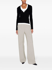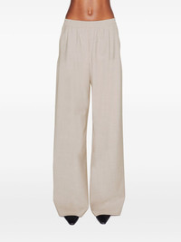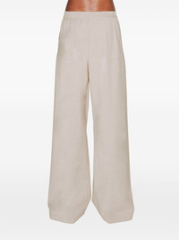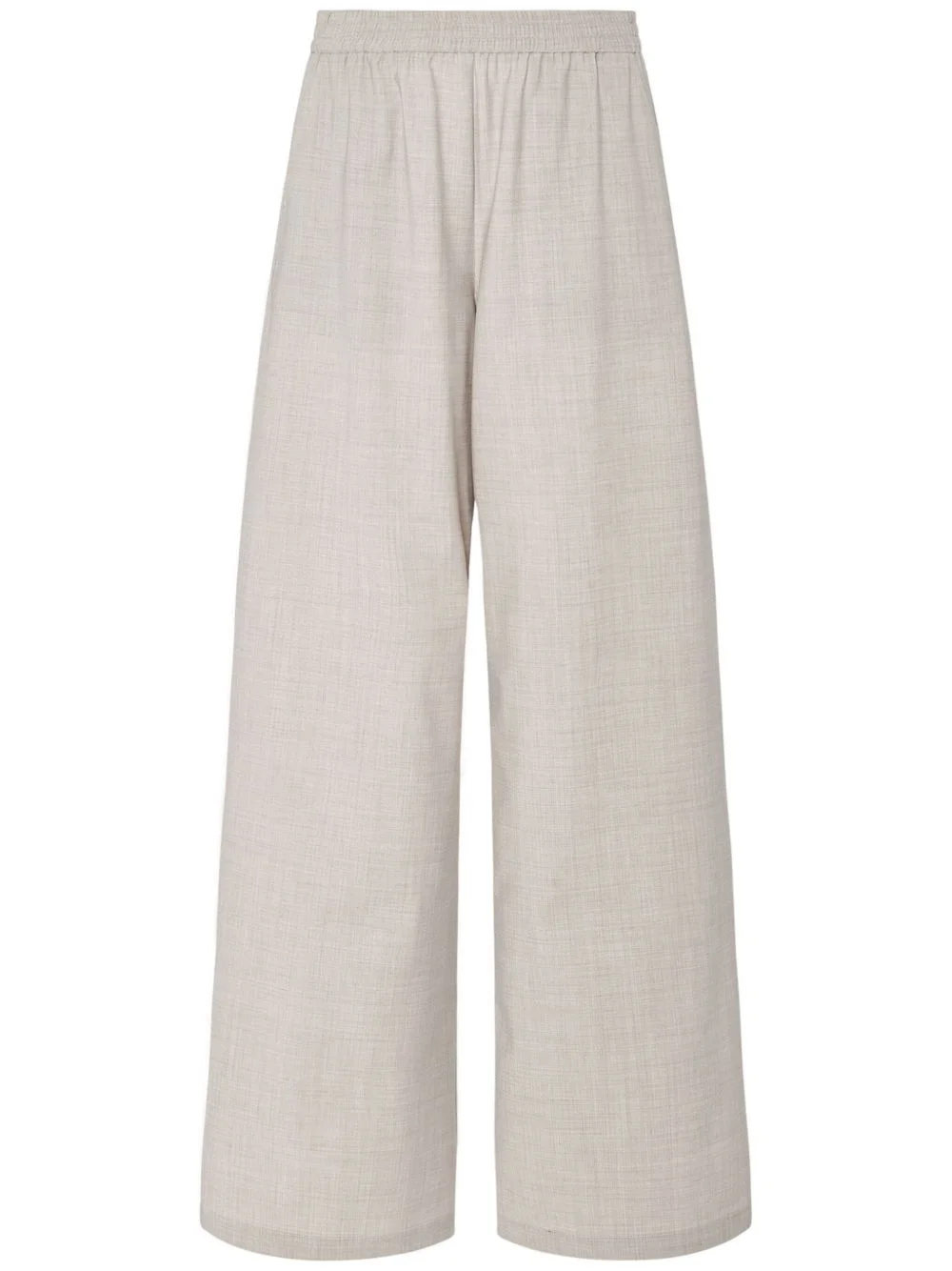 wide-leg wool-blend trousers Highlights - Beige - Virgin wool blend - Mid-rise - Elasticated waistband - Two side slit pockets - Wide leg Made in United States Composition Virgin Wool 52%, Polyester 43%, Elastane 5%