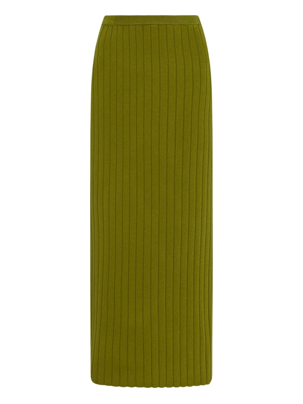 ribbed-knit midi skirt Highlights - Olive green - High-waisted - Vertical ribbing - Elasticated waistband - Fitted silhouette Imported Composition Viscose 83%, Polyester 17% Washing instructions Read Manufacturer Guidelines