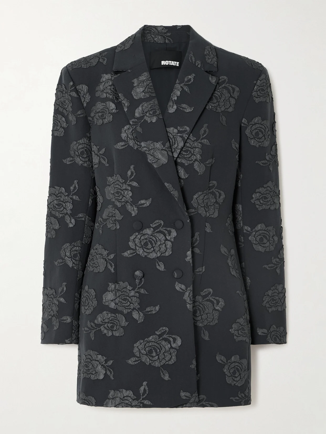 ROTATE Birger Christensen's mini dress mixes masculine and feminine dress codes for an elegant effect. It's cut like a double-breasted blazer from recycled-grain de poudre and appliqued with blooms. Elevate yours with sleek patent-leather pumps.