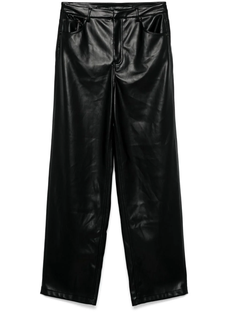 5 Pocket trousers Highlights - Black - Faux leather - Concealed front button, hook and zip fastening - Belt loops - Classic five pockets - Logo patch to the rear - Wide leg Imported Composition Outer: Polyester 100% Lining: Polyester 92%, Elastane 8% SIZE & FIT Model measurements Height 5 ft 9 in(1.75 m) Bust/Chest 31.88 in(81 cm) Hips 34.64 in(88 cm) Waist 24.01 in(61 cm) FittingInformation Designed with a wide-leg cut, these trousers allow for a close fit at the waist and offer a loose and roomy fit over the leg Made from a midweight non-stretch fabric, this piece offers minimal elasticity when worn