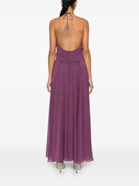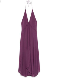 chiffon halterneck dress Highlights - Plum purple - Recycled polyester - Chiffon - Concealed rear hook and zip fastening - Halterneck tie fastening - V-neck - Sleeveless - Flared skirt - Partial lining - Low back Made in Italy Composition Lining: Polyester 92%, Elastane 8% Outer: Recycled Polyester 100% SIZE & FIT Model measurements Height 5 ft 10 in(1.78 m) Bust/Chest 33.07 in(84 cm) Hips 36.61 in(93 cm) Waist 24.8 in(63 cm) FittingInformation Designed for a close fit at the chest and waist with a loose fit at the hip Made from a midweight non-stretch fabric This piece fits true to size – take your usual size