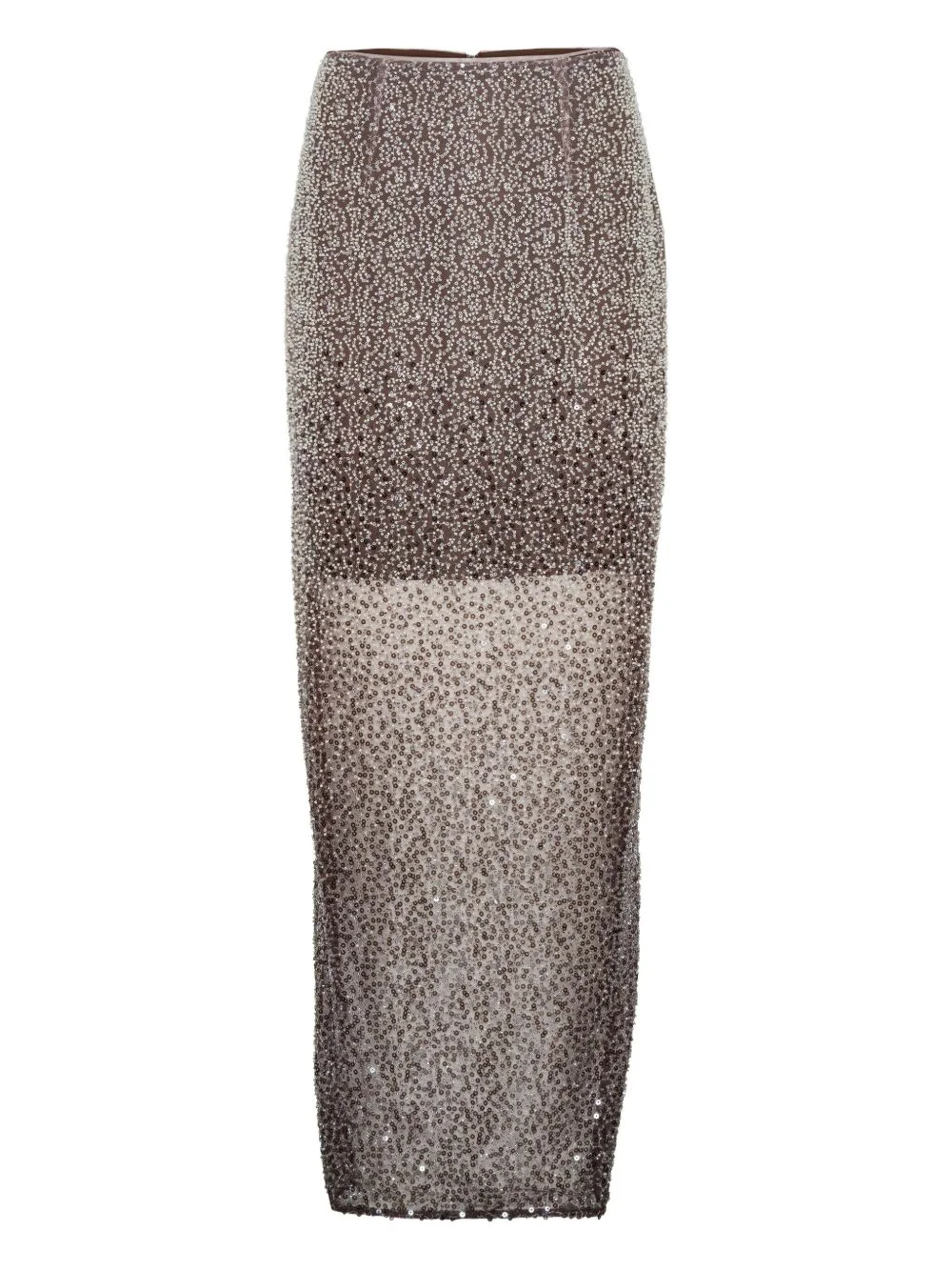 beaded maxi skirt Highlights - Brown - Beaded embellishment - Maxi length - Back slit Imported Composition Outer: Recycled Polyester 100% Lining: Polyester 95%, Elastane 5% Washing instructions Read Manufacturer Guidelines