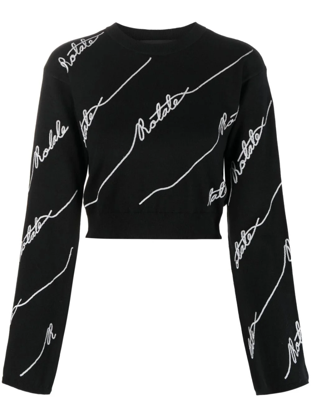 logo-embellished cropped jumper Leaning into contemporary styles, this recycled cotton-blend jumper by ROTATE BIRGER CHRISTENSEN features a cropped silhouette and is adorned with sequin-embellished branding throughout. Highlights - Black/white - Recycled cotton blend - Knitted construction - Sequin embellishment - Logo embellishment - Crew neck - Long sleeves - Ribbed hem - Cropped Imported Composition Polyester 100%, Recycled Cotton 65%, Polyamide 19%, Wool 16% SIZE & FIT Model measurements Height 5 ft 10 in(1.77 m) Bust/Chest 32.67 in(83 cm) Hips 35.43 in(90 cm) Waist 23.62 in(60 cm)