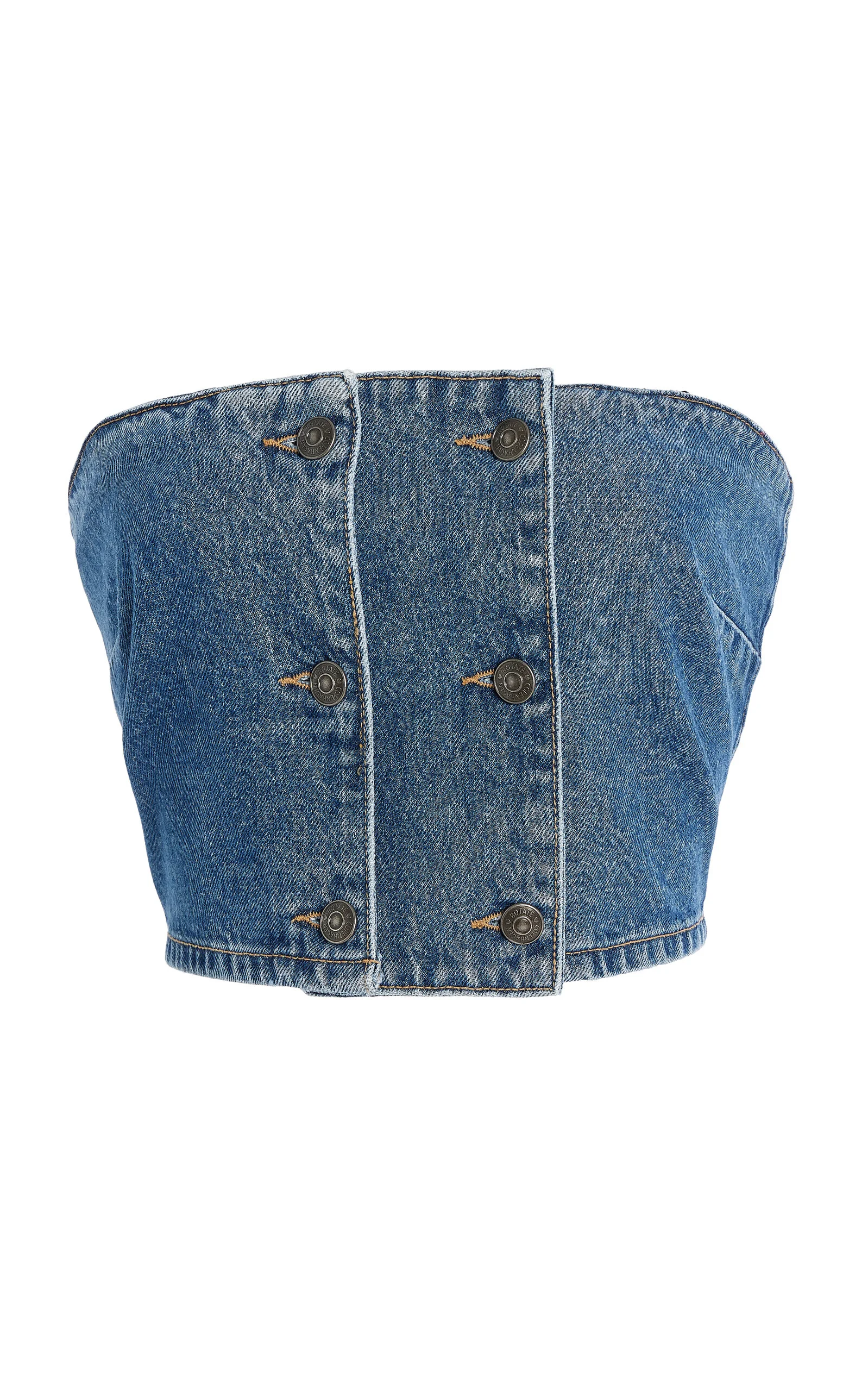 Throw on a party piece by Danish It girls Thora Valdimars and Jeanette Madsen, and you’re guaranteed to feel your oats—such is the power of their cool-girl glamour. This top has a bandeau silhouette with buttoned panels made from non-stretch denim. Wear yours with the matching jeans. PRODUCT DETAILS - Spring '25 - Button fastening - Composition: 100% cotton - Machine wash - Imported SIZE & FIT - Designed for a slim fit