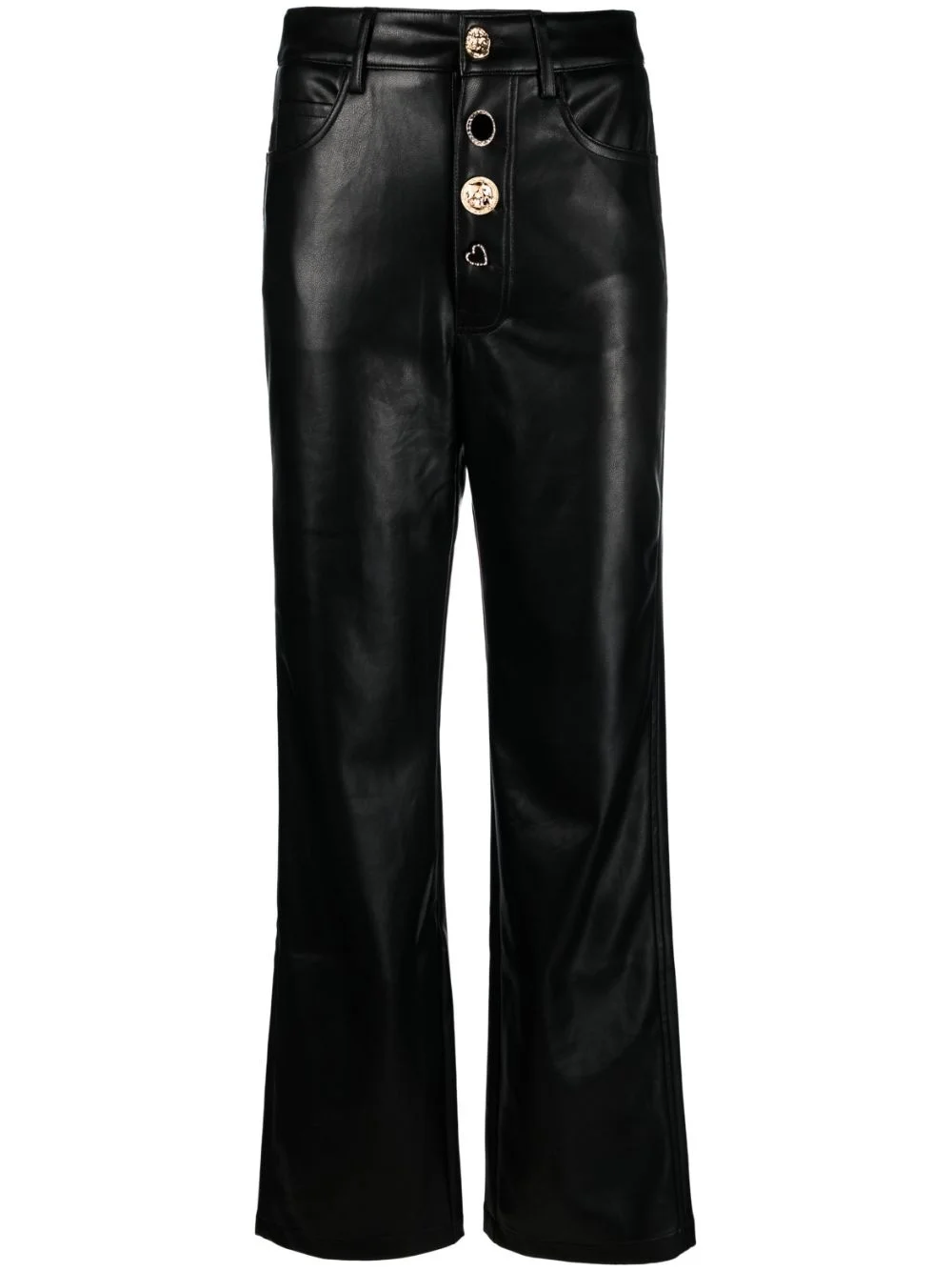 button-embellished high-waist trousers Highlights - Black - Faux leather - High waist - Embellished front button fastening - Classic five pockets - Belt loops - Straight leg Made in Italy Composition Outer: Polyurethane 100%, Recycled Polyester 100% Lining: Polyester 92%, Elastane 8% SIZE & FIT Model measurements Height 5 ft 10 in(1.78 m) Bust/Chest 33.07 in(84 cm) Hips 36.61 in(93 cm) Waist 24.8 in(63 cm) Measurement FRONT RISE 12 in(30.5 cm) HIPS 40.94 in(104 cm) WAIST 31.49 in(80 cm) Washing instructions Hand Wash