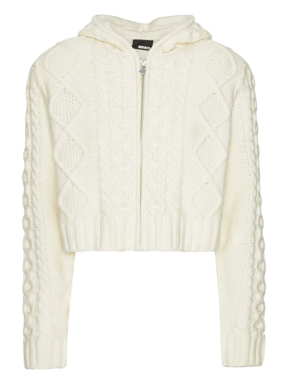 cable-knit hooded cardigan Highlights - Off-white - Cable knit - Hooded neckline - Zip fastening - Cropped length Imported Composition Wool 80%, Polyamide 20% Washing instructions Read Manufacturer Guidelines