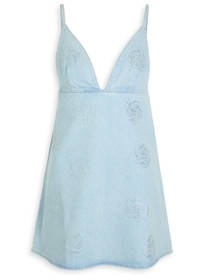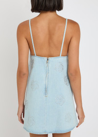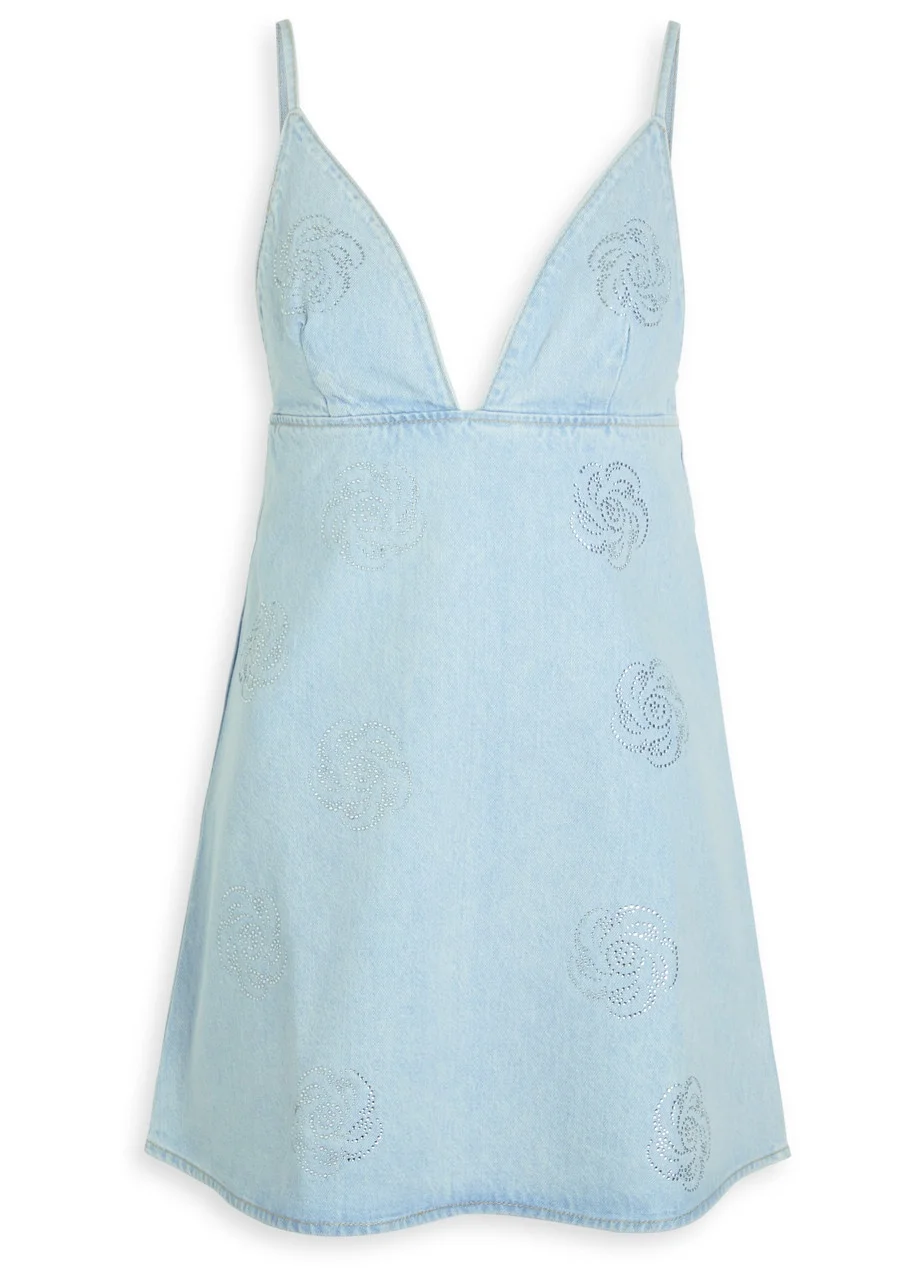 Info & Care ROTATE Birger Christensen denim dress Floral crystal embellishments, low V-neck, darts at bust, designer-engraved hardware, faded finish Zip fastening at back 100%;cotton Machine wash inside out to avoid colour transfer; Size & Fit Length shoulder to hem: 31 inches/ 77.5cm Midweight A-line cut,;close fit at bust Model is 5'9"/ 175cm and wears a size;FR36