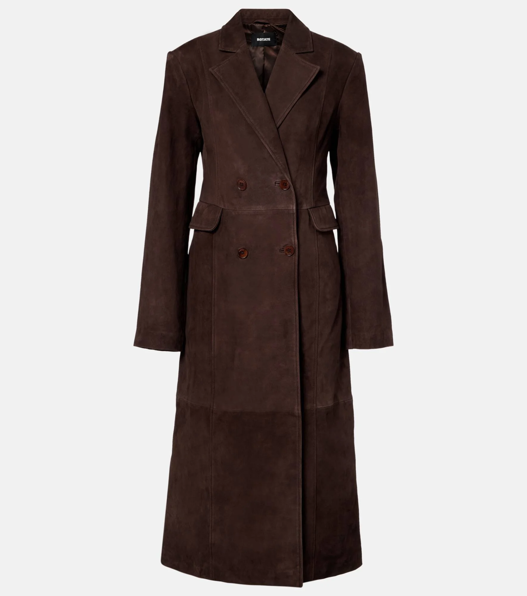 Fill the gaps in your going-out wardrobe with unique and glamorous styles from Rotate. This coat is crafted from supple suede and boasts a classic, double-breasted silhouette. Product Details - Material: 100% goat leather (suede) - Care instructions: specialist clean - Made in India - Designer color name: Chocolate Brown - Item color: brown - Lining: 100% polyester (recycled) - Contains non-textile parts of animal origin - Notched lapel - Shoulder pads - Pockets: flap pockets - Closure: double-breasted (four buttons) - Hem: straight - Vent: single - Item number: P01113087 Size & Fit - True to size - Shoulder pad inserts - Cinched waist - Non-stretchy fabric - The model seen in the picture is 178cm-5'10" and wearing a size DE 34
