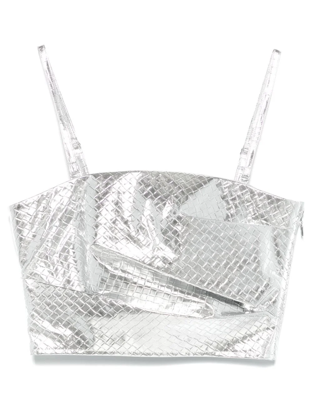 draped braided top Highlights - Silver-tone - Recycled polyester - Braided design - Draped detailing - Side zip fastening - Adjustable spaghetti straps - Square neck - Full lining - Straight hem Imported Composition Outer: Recycled Polyester 100% Lining: Polyester 92%, Elastane 8% SIZE & FIT Measurement LENGTH 9.25 in(23.5 cm)