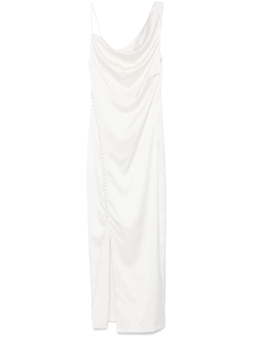 draped satin dress Highlights - Almond beige - Concealed side zip fastening - Decorative button detailing - Asymmetric neck - Cowl effect Imported Composition Lining: Polyester 100% Outer: Recycled Polyester 96%, Elastane 4% SIZE & FIT Model measurements Height 5 ft 10 in(1.78 m) Bust/Chest 32.67 in(83 cm) Hips 35.43 in(90 cm) Waist 23.22 in(59 cm) FittingInformation Designed for a slim fit that sits just away from the body offering a close yet comfortable fit Made from a lightweight fabric