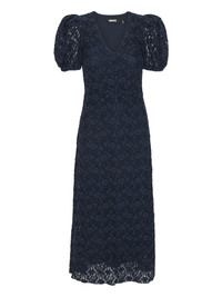 puff-sleeve lace midi dress Highlights - Navy blue - Lace fabric - Puff sleeves - V-neck - Midi length Imported Composition Outer: Recycled Polyamide 50%, Cotton 40%, Elastane 10% Lining: Viscose 97%, Elastane 3% Washing instructions Machine Wash