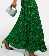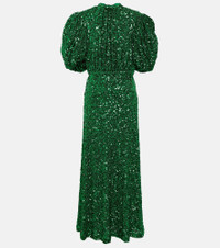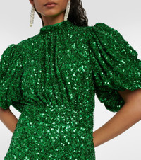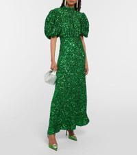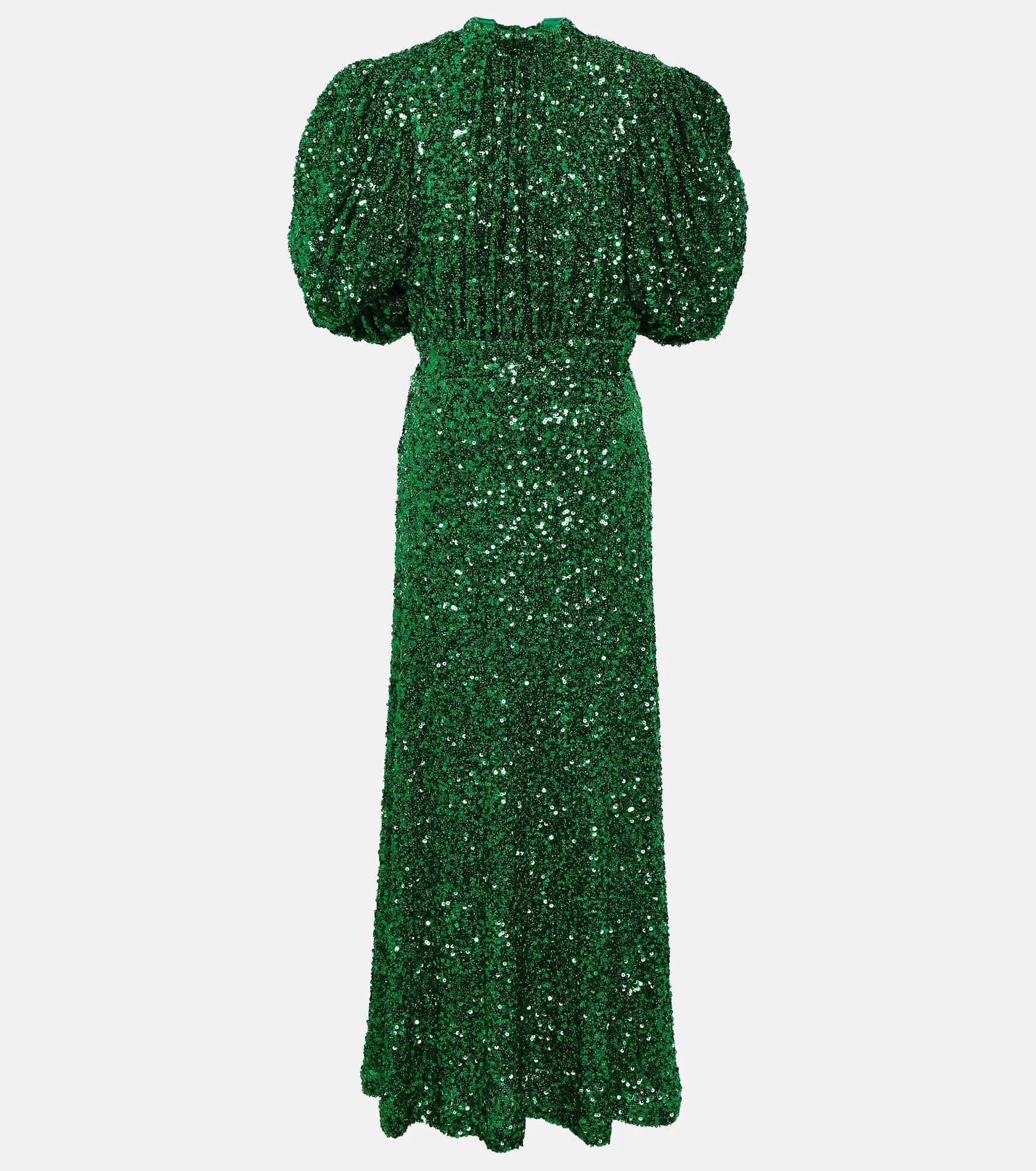 Take on the stage with this embellished puff-sleeve maxi dress from Rotate Birger Christensen. This vibrant style features puffy sleeves, a high neckline, and an open back. Product Details - Material: 95% recycled polyester, 5% elastane - Care instructions: dry clean - Lining: fully lined, 5% elastane, 95% polyester - Designer color name: Green - Made in China - Embroidery: 100% polyester - Closure: self-ties - Item number: P00832462 Size & Fit - True to size - Oversized shoulders - Low back - Cinched waist - Slightly stretchy fabric - The model seen in the picture is 178cm-5'10" and wearing a size DT 34