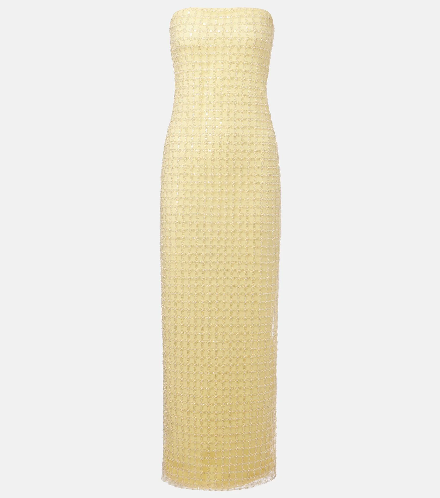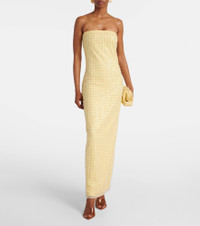 Fill the gaps in your going-out wardrobe with unique and glamorous styles from Rotate. This gown comes in a strapless silhouette, embellished with dazzling sequins arranged in a checked pattern. Product Details - Material: 100% polyester - Care instructions: hand wash - Made in China - Designer color name: Pastel Yellow - Item color: yellow - Lining: 96% polyester, 4% elastane - Item number: P01049620 Size & Fit - True to size - Strapless - Fitted - Non-stretchy fabric - slit length 57.0cm-22.5" - The model seen in the picture is 178cm-5'10" and wearing a size DE 34