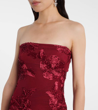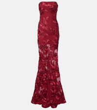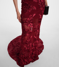 Fill the gaps in your going-out wardrobe with unique and glamorous styles from Rotate. Crafted from mesh, this strapless gown is detailed with a fishtail hemline and statement floral-appliques for an elegant edge. Product Details - Material: 95% polyester (recycled), 5% elastane - Care instructions: dry clean - Made in China - Designer color name: Sun Dried Tomato - Item color: burgundy - Hardware color: silver - Details: 100% polyester - Lining: 88% polyester, 12% elastane - Closure: concealed zipped back - Item number: P01113100 Size & Fit - True to size - For larger bust sizes we recommend taking one size up - Strapless - Fitted - Slightly stretchy fabric - The model seen in the picture is 178cm-5'10" and wearing a size DE 34